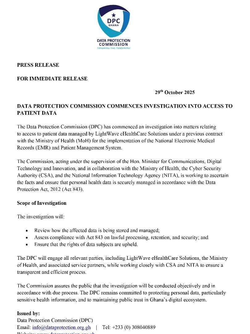 In a statement issued on Wednesday, October 29, 2025, the Commission said the probe seeks to ensure that all personal health data is being handled securely and in strict compliance with the Data Protection Act, 2012 (Act 843).