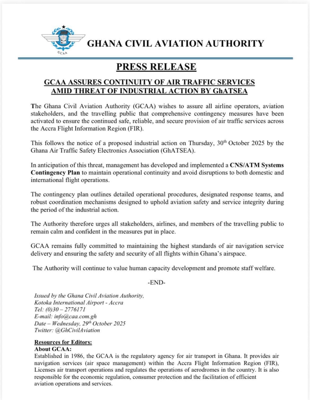 The Ghana Civil Aviation Authority (GCAA) has assured airline operators, aviation stakeholders, and the travelling public that air traffic services will continue without disruption despite a planned industrial action by the Ghana Air Traffic Safety Electronics Association (GhATSEA).